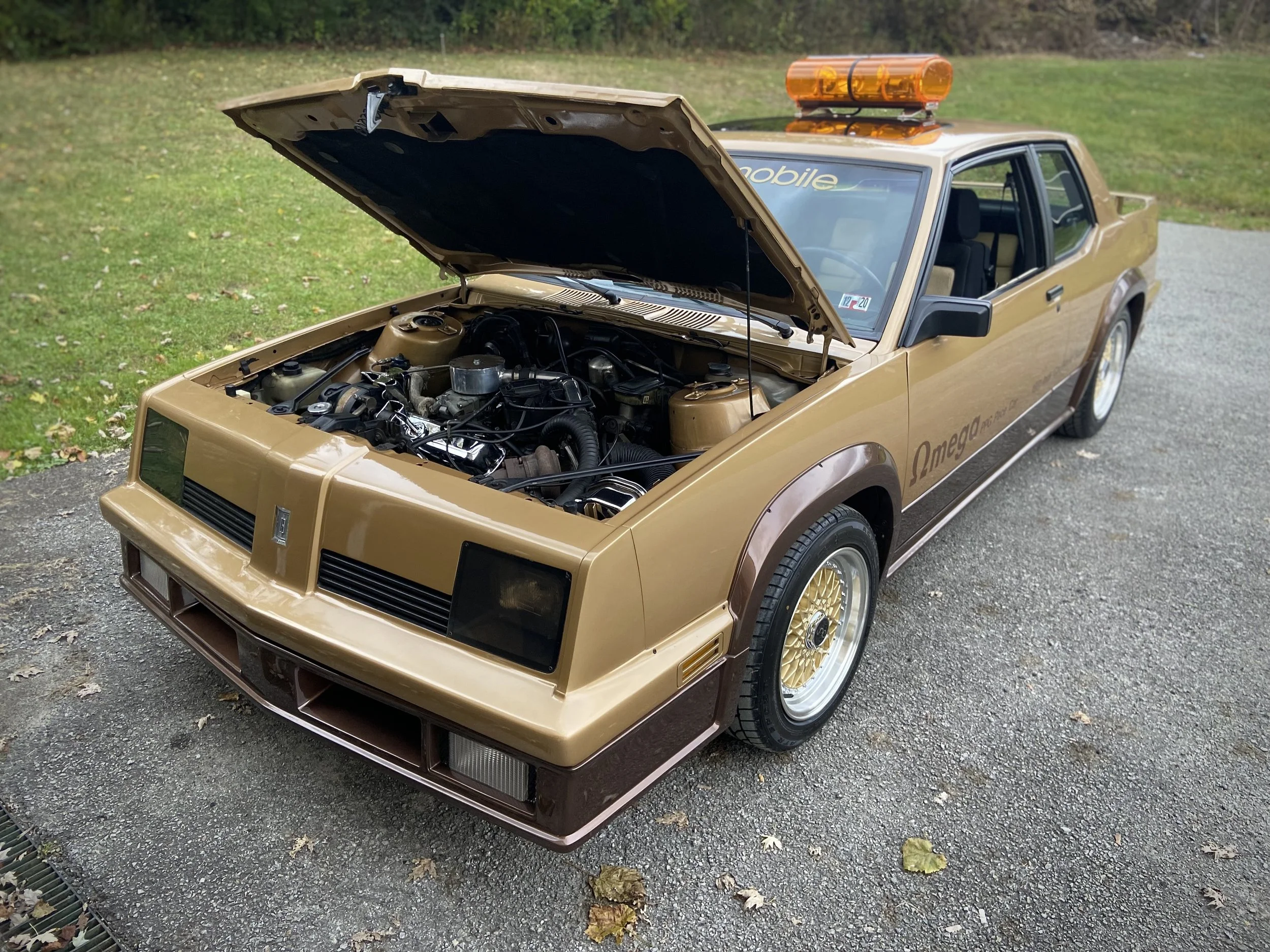 While the car does not have a lot of documentation the story is unraveling. Mike knows that the car was sold by Bendik Oldsmobile in Pittsburgh PA and after its pace car campaign was sold back. The car was put up on the 3rd story of the facility and used as a promo car until the closing of the dealership. From there the car gets lost in history for 26 years, purchased by the gentleman that Mike bought the car from Marion “Babe” of Marion motors in Connellsville, PA. He used it as a weekend cruiser, changing up some items like the wheels and occasionally took it to a car show. While he knew the history of the car he did not advertise it as it was just another Omega from the era…and this folks is how cars get lost. When Mike purchased the car it had 13.6K miles on the odometer and it still ran! Below is how the car looked that day, no light bar and wheels that had been swapped.