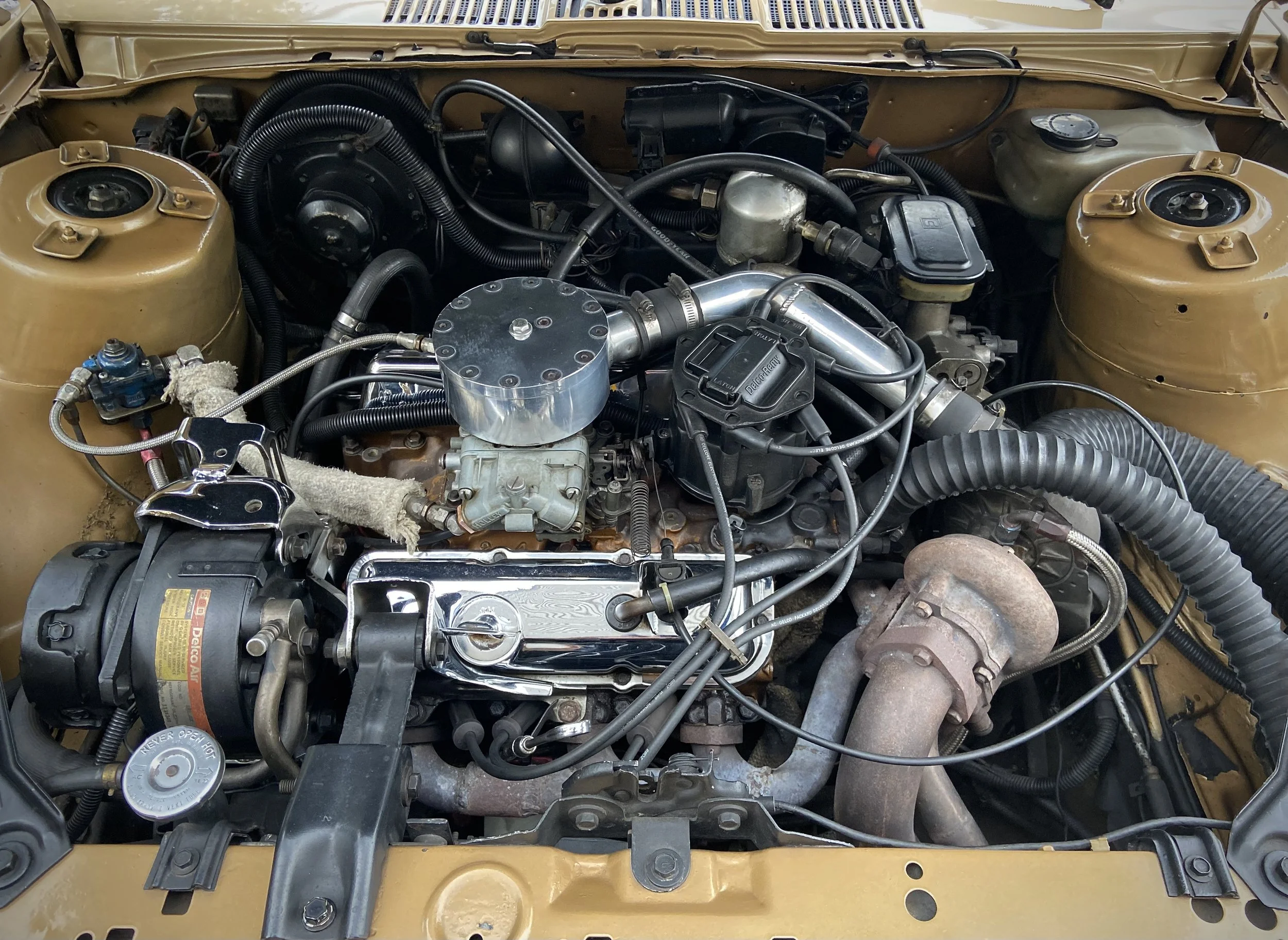 The motor is the most mysterious on the car. With the transverse V6 mounted dead center this is in fact a front wheel drive configuration! Upgrades under the hood include a turbo that feeds into a handmade top hat that feeds straight into the carburetor. The handmade one off hat is also fitted with a rudimentary blow off valve that is basically a pressure valve that has been turned backwards. Other handmade parts include an exhaust manifold that still dons the handmade welds and marks of its fabricated origins. The Mitsubishi mini turbo looks industrial, perhaps something off of a forklift or small diesel K truck. The fuel system has been upgraded to handle the additional horsepower. As of right now the only upgrade that Mike knows on the engine internals are roller rockers and a larger capacity oil pan. Until the car needs a rebuild or unless someone tracks down the original engineers this will be one of the last mysteries of the car!